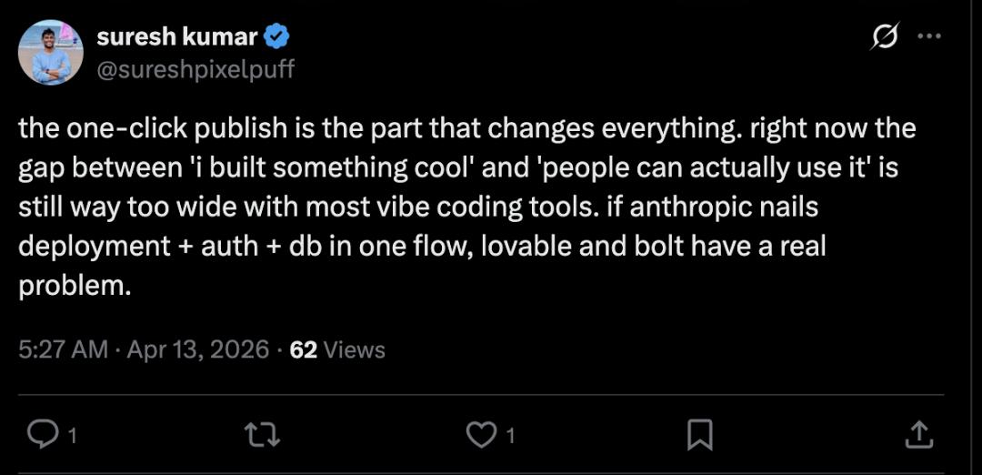 “目前,大多数基于 Vibe 的编码工具在‘我做出了很酷的东西’和‘人们真正能用它’之间仍然存在着巨大的鸿沟。如果 Anthropic 能够将部署、身份验证和数据库集成到一个流程中,那么 Lovable 和 Bolt 就真的面临严峻的挑战了。”