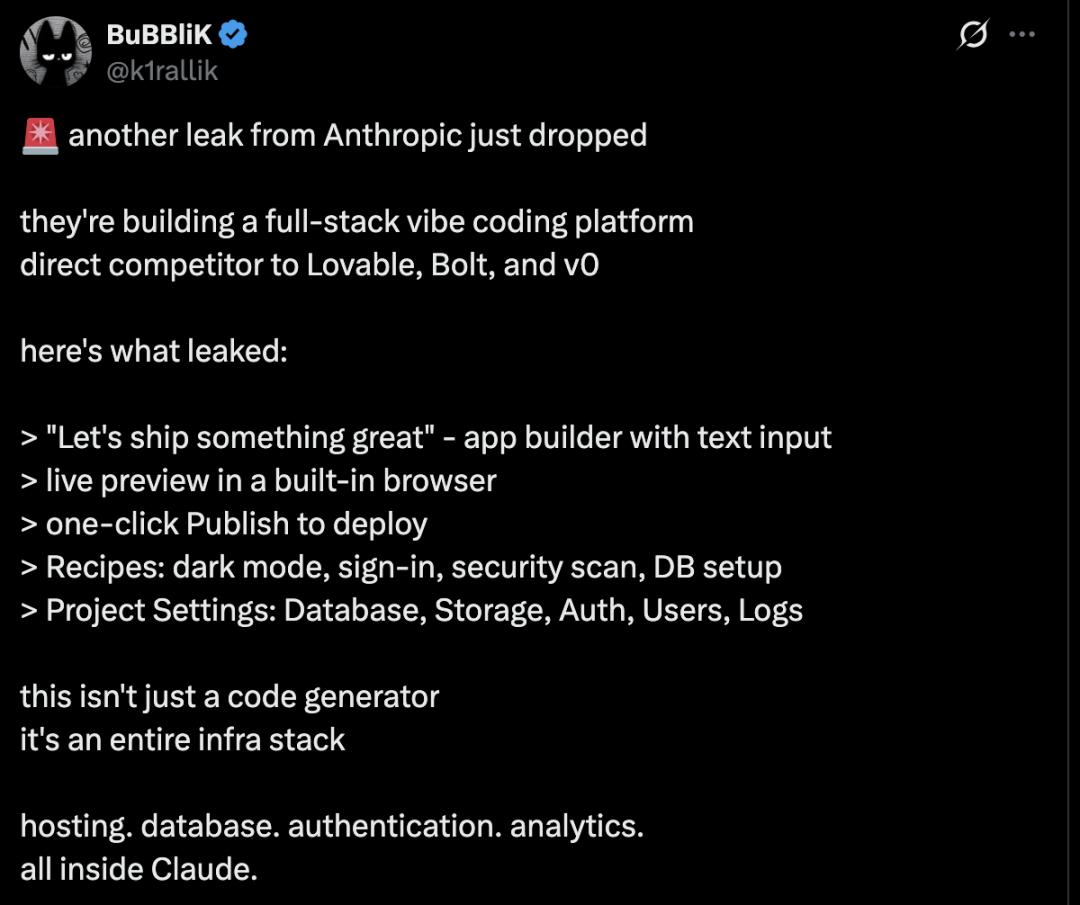 随后,名为 @k1rallik 的网友甚至,扒出了此次泄漏的细节。他写道:“Anthropic 又泄露了一条消息,他们正在构建一个全栈式 Vibe 编码平台,与 Lovable、Bolt 和 v0 直接竞争。”
