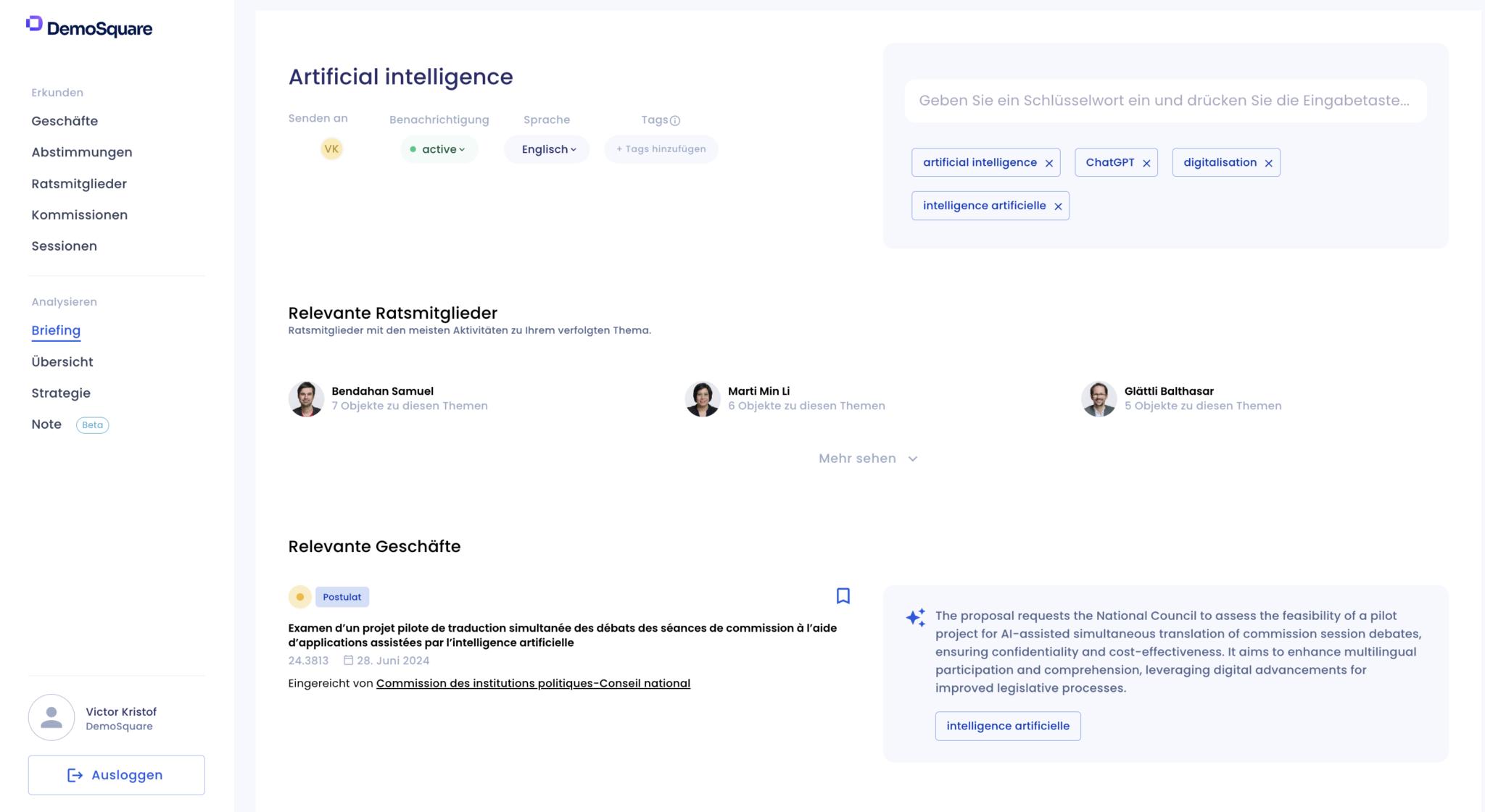 2025年4月,DemoSquare在布鲁塞尔启动了其欧盟版本软件。2026年2月和3月,公司宣布分别与瑞士国家通讯社Keystone-SDA、欧洲领先的事务新闻和分析提供商Euractiv 建立战略合作伙伴关系,将其新闻源整合至公司软件,帮助用户及早洞察政治、经济和社会领域的热点议题。目前,公司在瑞士的首批客户包括多家跨国公司和大型公共机构。