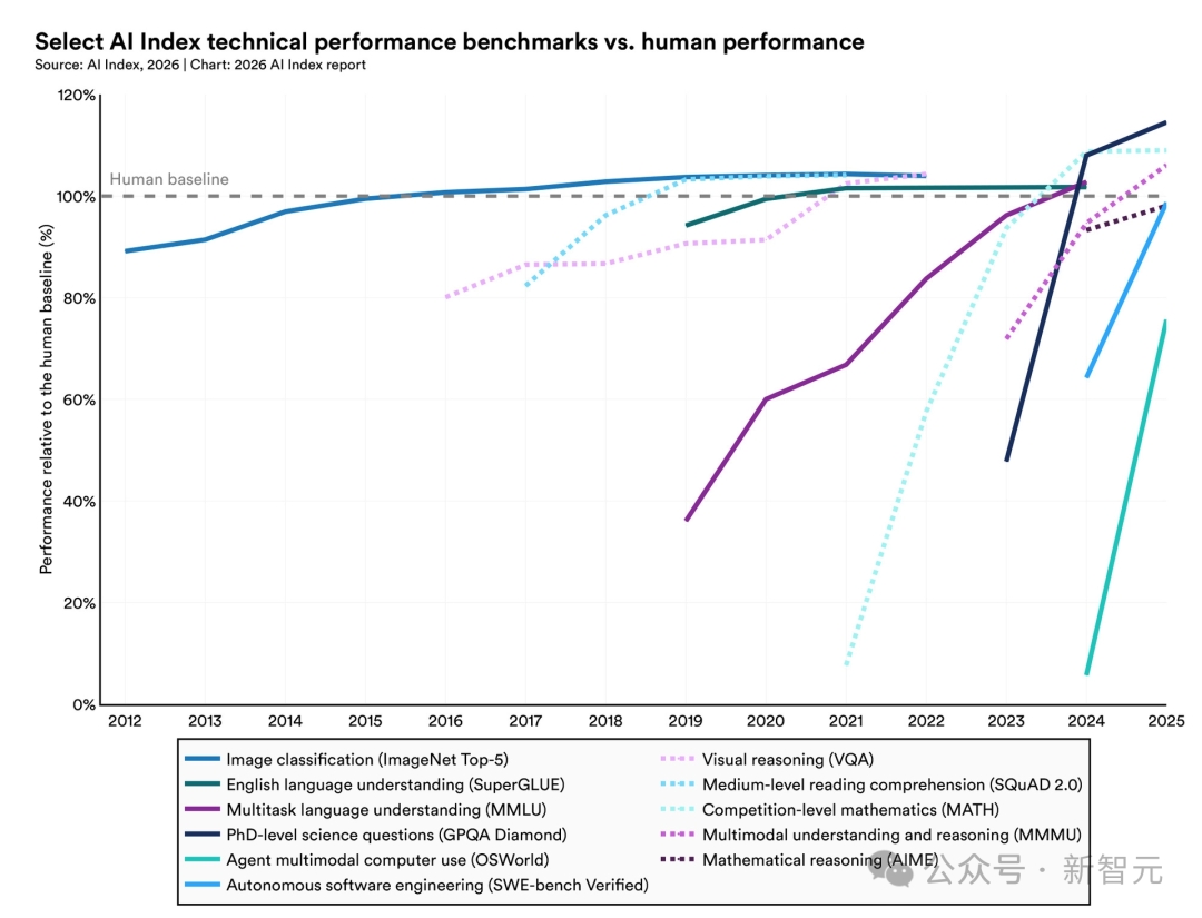 过去一年,全球超90%的顶尖模型,在博士级科学问题、多模态推理、竞赛数学上的表现,追平甚至超越了人类。