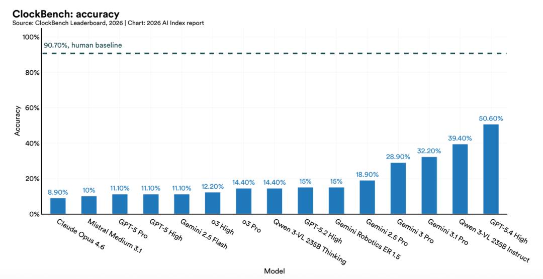 最强模型在「读模拟时钟」这个任务上的正确率,是50.1%。