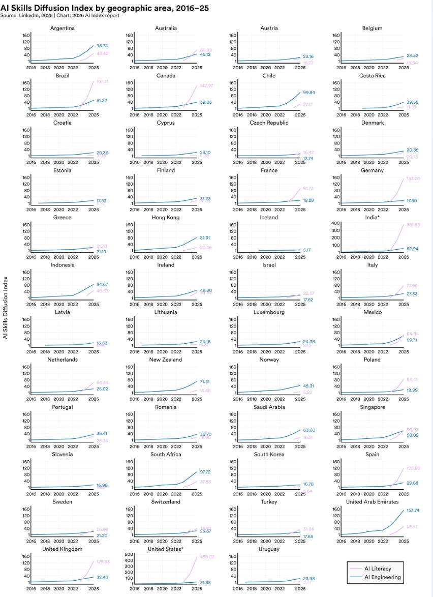 在全球范围内,AI工程技能增长最快的国家,反而是阿拉伯联合酋长国、智利和南非。