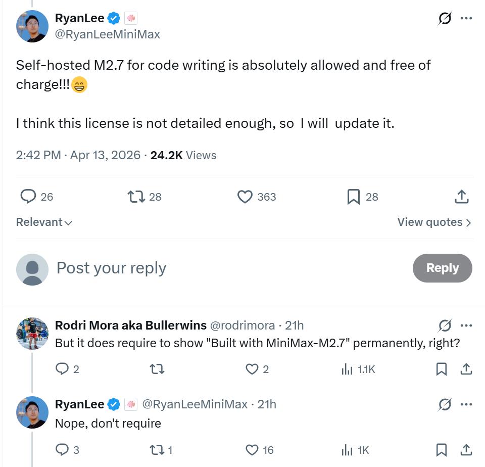 此外,新授权协议有一项展示要求:所有商业用途都必须在相关网站、界面或文档中显著标注 “Built with MiniMax M2.7”(采用 MiniMax M2.7 构建)。但在帖子评论区,Lee 反复强调,“自托管的 M2.7 用于代码编写是绝对允许且免费的,并且不需要显示‘使用 MiniMax-M2.7 构建’。”