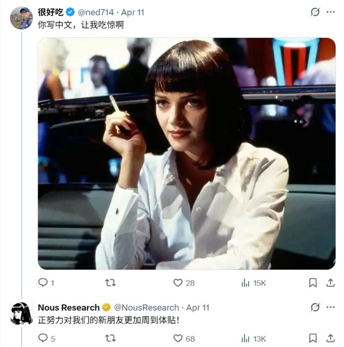 以及面对中文的留言,Nous Research都会用中文进行回复,再次提高了对中文社区的亲和力。