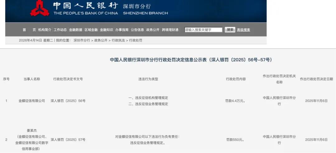 2025年11月,央行深圳分行给金蝶征信开了张4.4万的罚单。