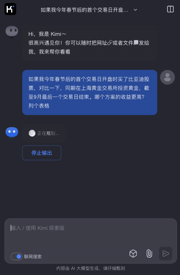 上面的问题实际上至少包含了三个子问题,如果用传统的方式需要进行多次手动搜索和操作,可以看到Kimi的思维过程,通过分别查找比亚迪股价、金价以及最后生成表格进行对比给出了答案。