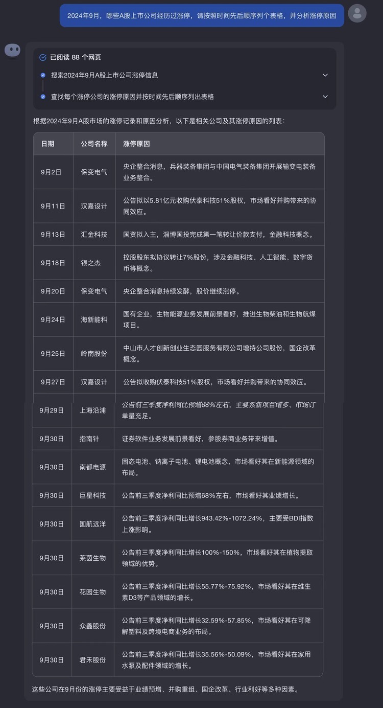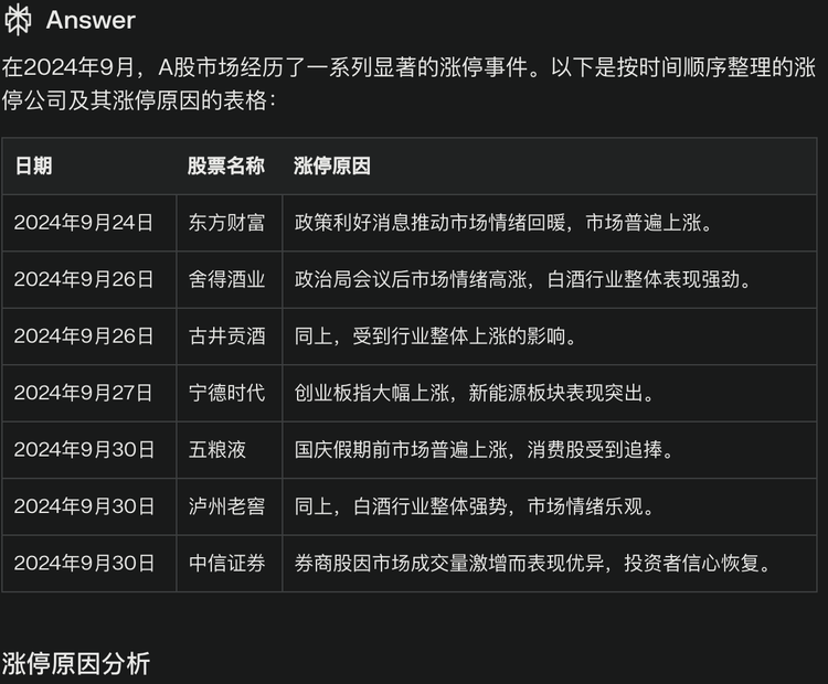首先是涉及大量数据处理的任务,问:2024年9月,哪些A股上市公司经历过涨停,请按照时间先后顺序列个表格,并分析涨停原因。