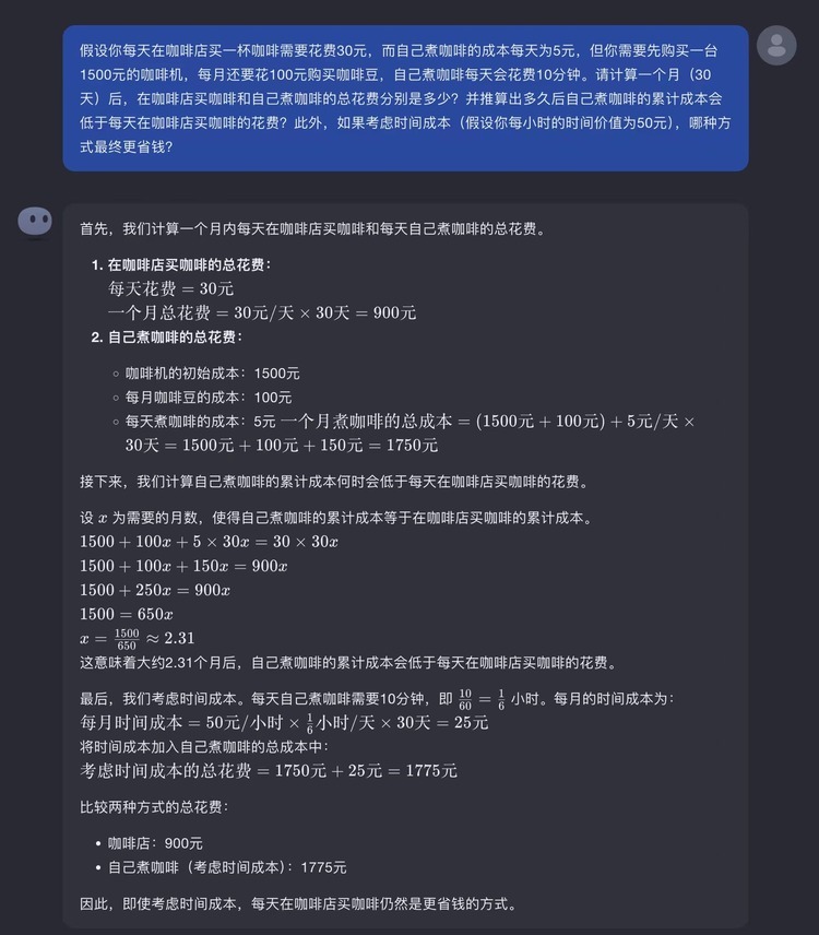 让Kimi帮你对比咖啡店买咖啡VS自己煮咖啡:假设你每天在咖啡店买一杯咖啡需要花费30元,而自己煮咖啡的成本每天为5元,但你需要先购买一台1500元的咖啡机,每月还要花100元购买咖啡豆,自己煮咖啡每天会花费10分钟。请计算一个月(30天)后,在咖啡店买咖啡和自己煮咖啡的总花费分别是多少?并推算出多久后自己煮咖啡的累计成本会低于每天在咖啡店买咖啡的花费?此外,如果考虑时间成本(假设你每小时的时间价值为50元),哪种方式最终更省钱?