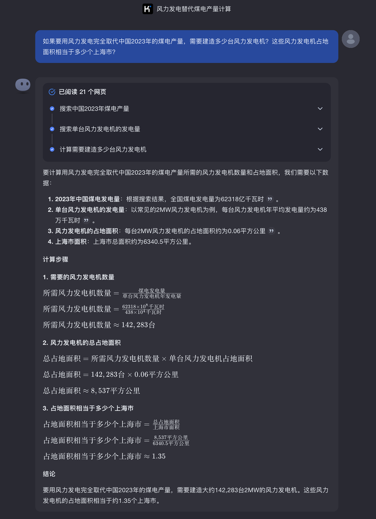 用Perplexity付费的Pro模式进行对比,在经过一番计算之后,Perplexity给出了一个比较离谱的答案,检查后发现Perplexity在估算风力发电机的数量和占地面积的步骤出现了明显的问题。