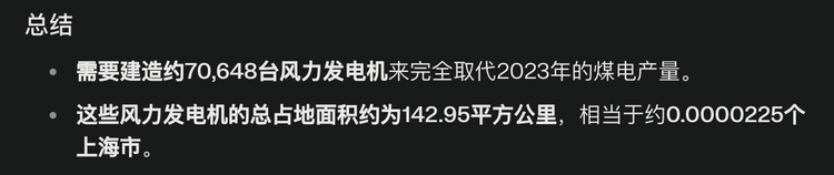 上面的问题可能太常见,再来个“题库”里没有的问题:如果要用风力发电完全取代中国2023年的煤电产量,需要建造多少台风力发电机?这些风力发电机占地面积相当于多少个上海市?