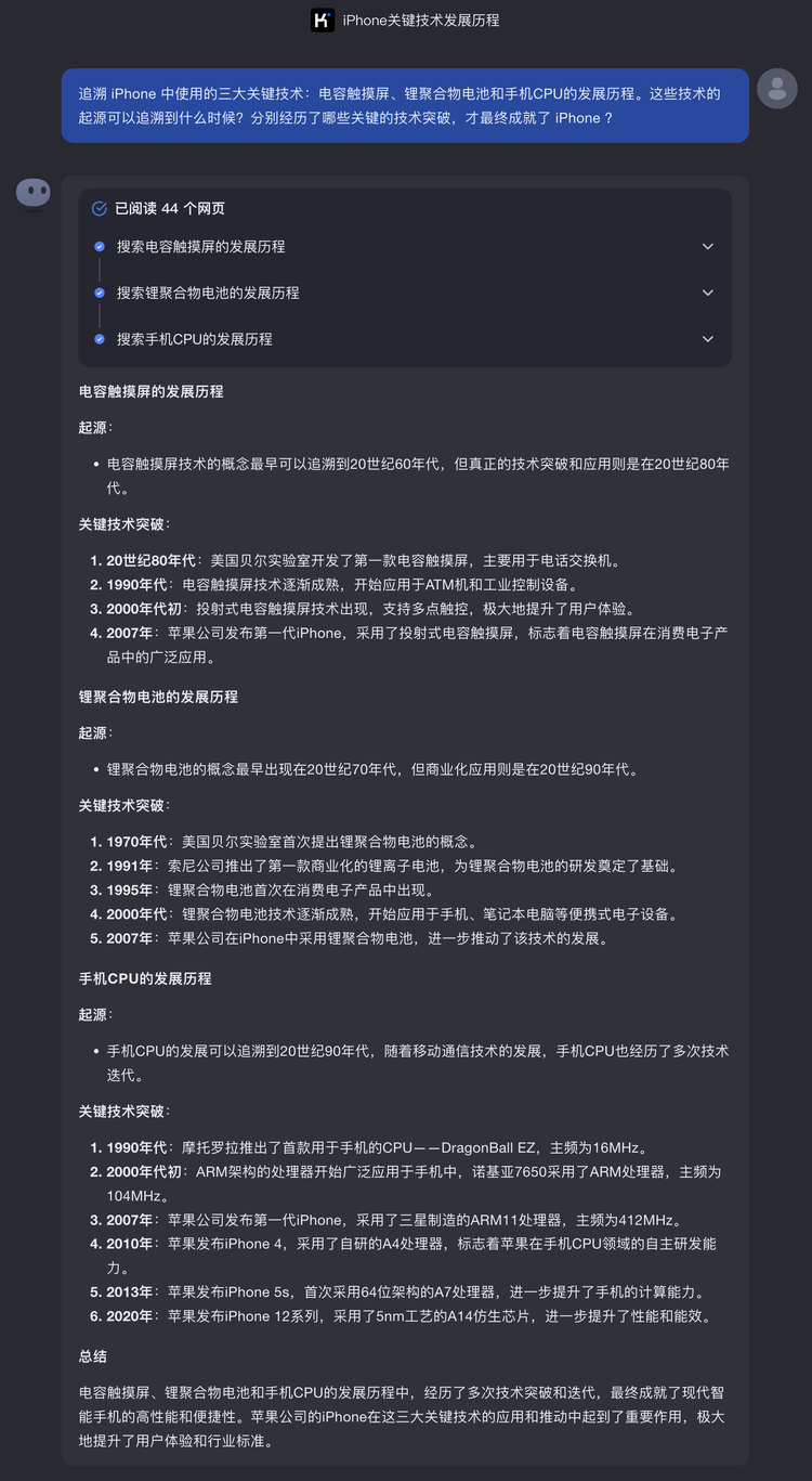 除了金融和历史,再来看看Kimi探索版是否能够理解技术演进的复杂性:追溯 iPhone中使用的三大关键技术:电容触摸屏、锂聚合物电池和手机CPU的发展历程。这些技术的起源可以追溯到什么时候?分别经历了哪些关键的技术突破,才最终成就了iPhone ?