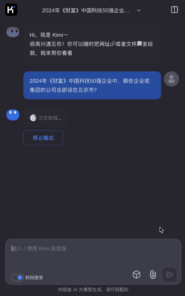 提出问题后,Kimi快速从232个的网页中检索了相关信息,包括问题中提到的2024年《财富》中国科技50强企业名单及总部信息,接着将检索到的各公司总部所在地进行分类整理,并直观地呈现给用户。
