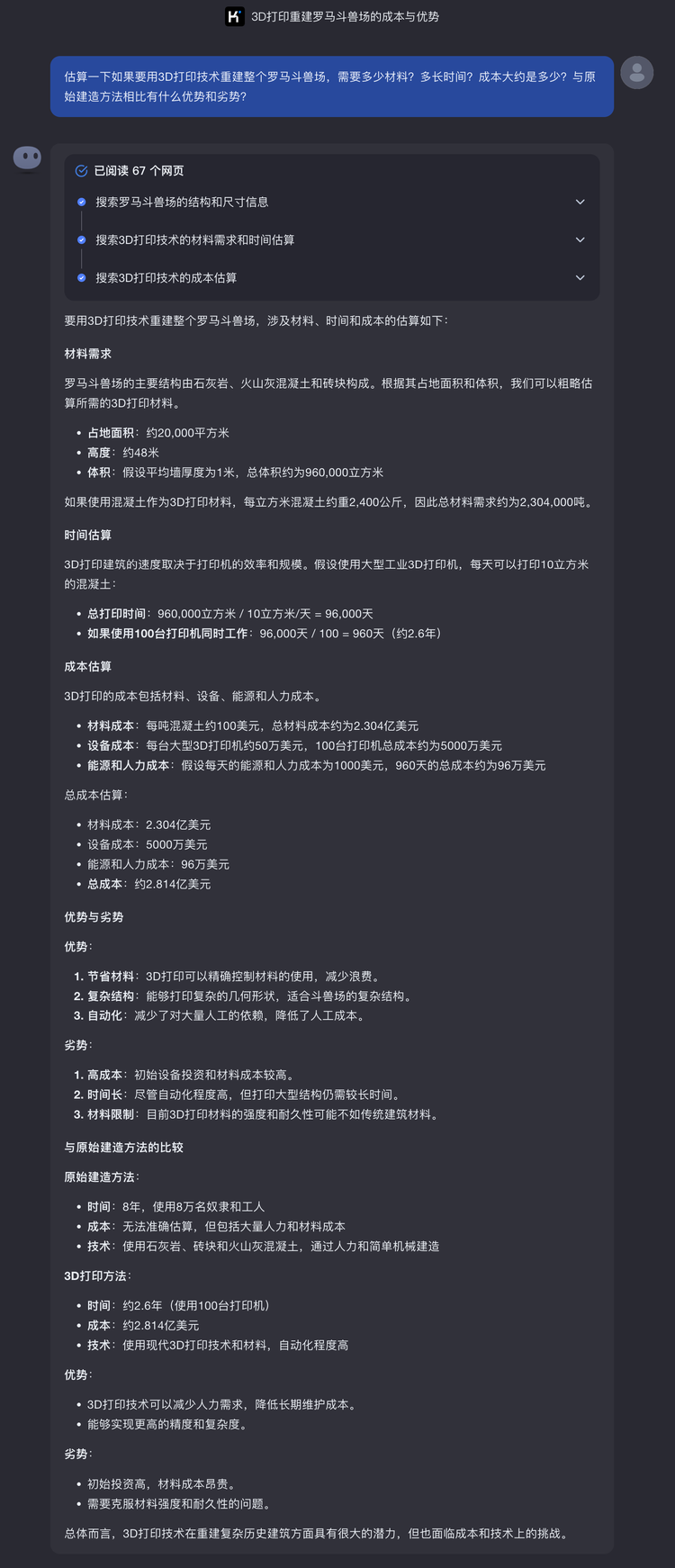 Kimi首先通过信息检索获取相关数据,对问题进行了分解,比如计算3D打印罗马斗兽场所需的材料、时间和成本。接着,它基于这些数据进行估算和分析,逐步回答每个问题,并对比3D打印和传统建造方法的优缺点,最终给出完整且清晰的解决方案。我们可以看到从信息获取、数据处理到逻辑推理和建议的完整思考过程。