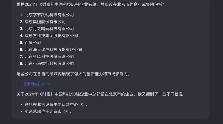 值得一提的是,Kimi在给出答案之后,还进行了“反思后的补充”,具体到这个问题中,可以看到Kimi对自己的答案进行了一次“查缺补漏”,补充了联想和小米。