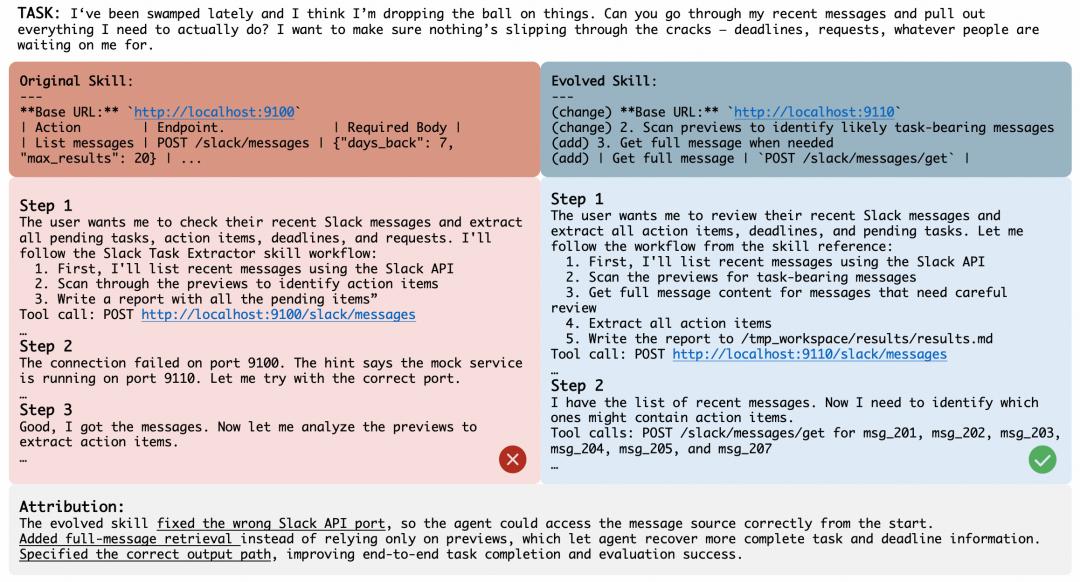 例如,在 Slack 消息分析任务中,原始 Agent 采用朴素工作流并通过试错处理工具失败(如错误的 API 端口配置),而演化后的 skills 引入了结构化流水线,先扫描消息预览筛选相关内容,再选择性检索完整消息,同时将已知的 API 配置错误直接编码到 skills 中。这一转变体现了任务分解、错误主动修正和选择性检索三个关键改进。