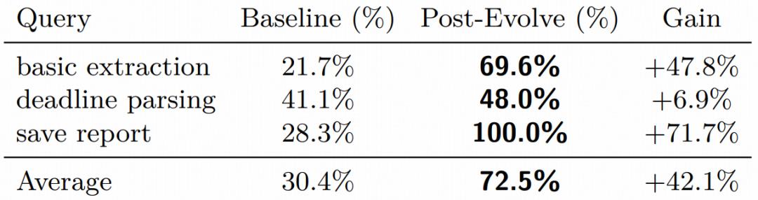 同时,在受控验证实验中,针对“基础提取”、“截止日期解析”、“保存报告”定制查询,单轮演化后平均提升达到了 42.1%。其中,save report 从 28.3% 提升至 100.0%,初始失败源于缺少环境特定流程(如输出路径和格式),一旦被编码为可复用 skills 即可完全修正。