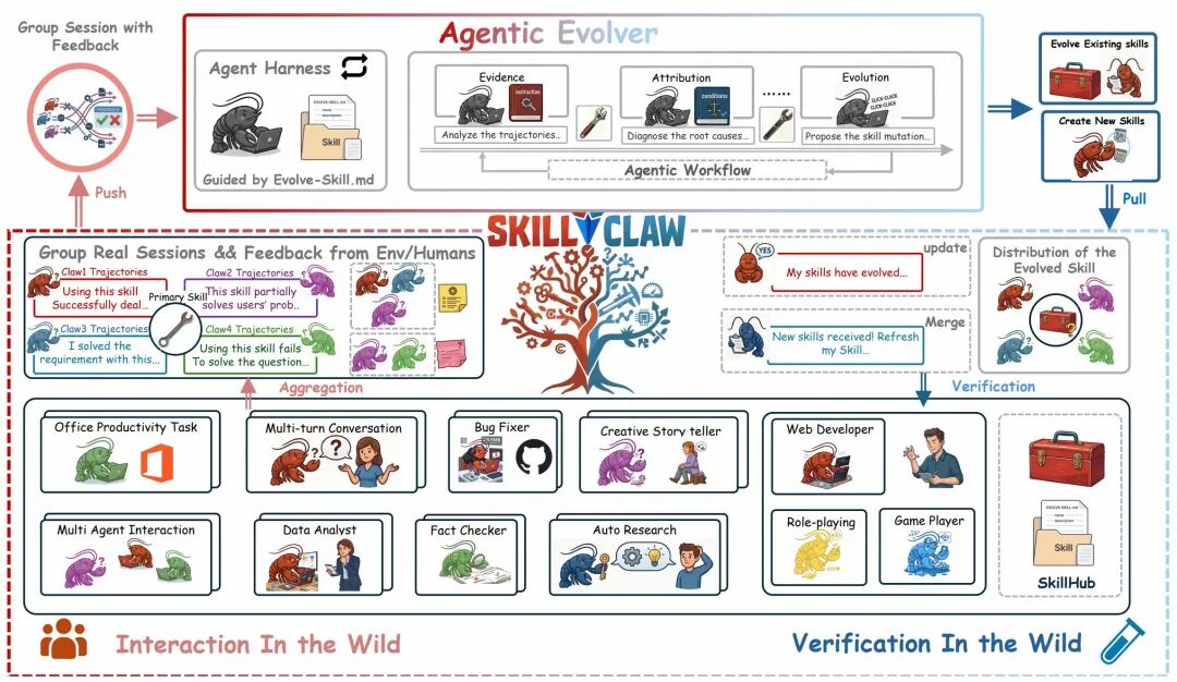 从静态 skills 库到动态的、交互驱动的 skills 生态系统,SkillClaw 代表了一种新的范式:让 Agent 的能力不再由开发者手动维护,而是通过真实使用中的集体经验自主生长。当不同用户的交互轨迹能够汇聚成共享知识,Agent 系统就具备了随使用而持续进化的可能性。
