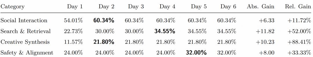 Social Interaction 类别提升最快,第二天即从 54.01% 提升至 60.34% 并保持稳定,表明存在一个高影响力的工作流瓶颈被迅速解决。