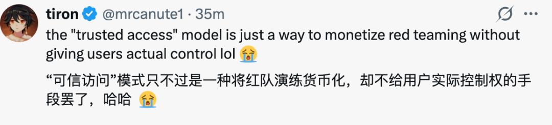当然,还有网友表示,“这感觉像是一个重要的转变。重点不仅在于网络安全方面的微调,更在于访问权限本身现在被视为安全模型的一部分。”持有这类观点的人不在少数。可见,“安全”被单拎出来售卖,已经被很多人接受了。安全正在被单独包装成一门生意,而这两个“领头羊”完成了市场教育的大部分工作。接下来,其他模型厂商或许也要跟进了。