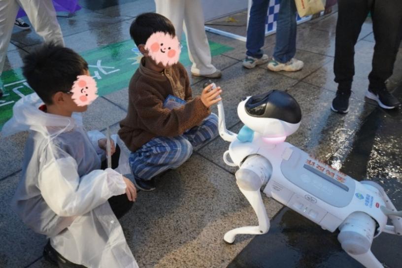 球迷们与机器人、机器狗互动