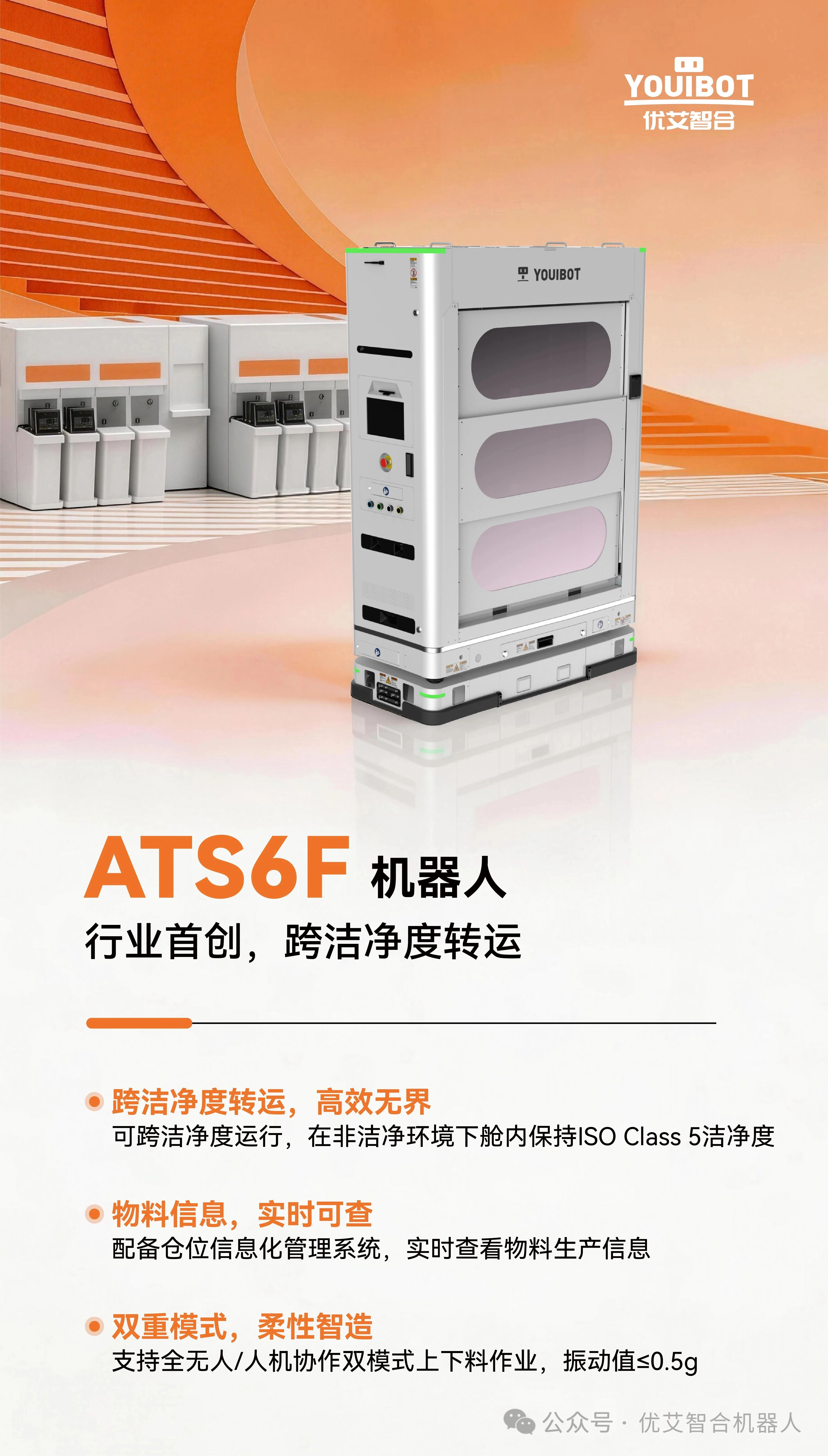 ATS6F机器人支持跨洁净环境运行,最高满足ISO CLASS 5 环境需求,可高效通过跨车间、电梯、长连廊、风淋室等多种复杂场景;振动值控制在≤0.5g,兼具高效、小巧、高通过性等特点,解决跨区域作业痛点。尤其在连廊运输环节,展现出极强的实用性与经济性。