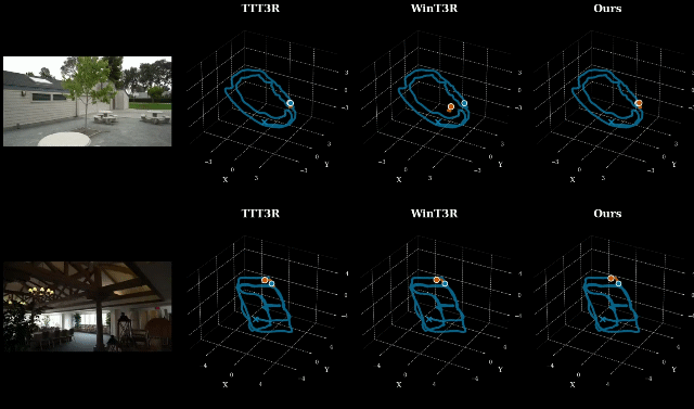 这一设计借鉴了经典 SLAM 系统对空间信息分层管理的思路,但突破了传统方法依赖手工设计和复杂优化的局限,将核心逻辑交由模型统一学习完成,在长序列场景下也能保持稳定表现。