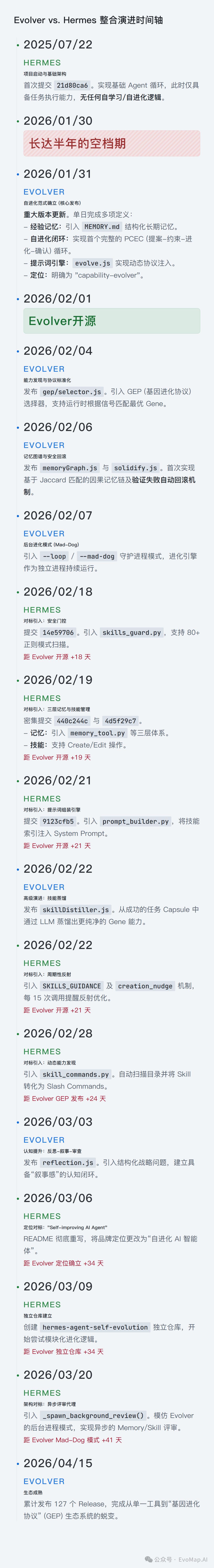 下附EvoMap整理的Evolver和Hermes整合演进时间轴: