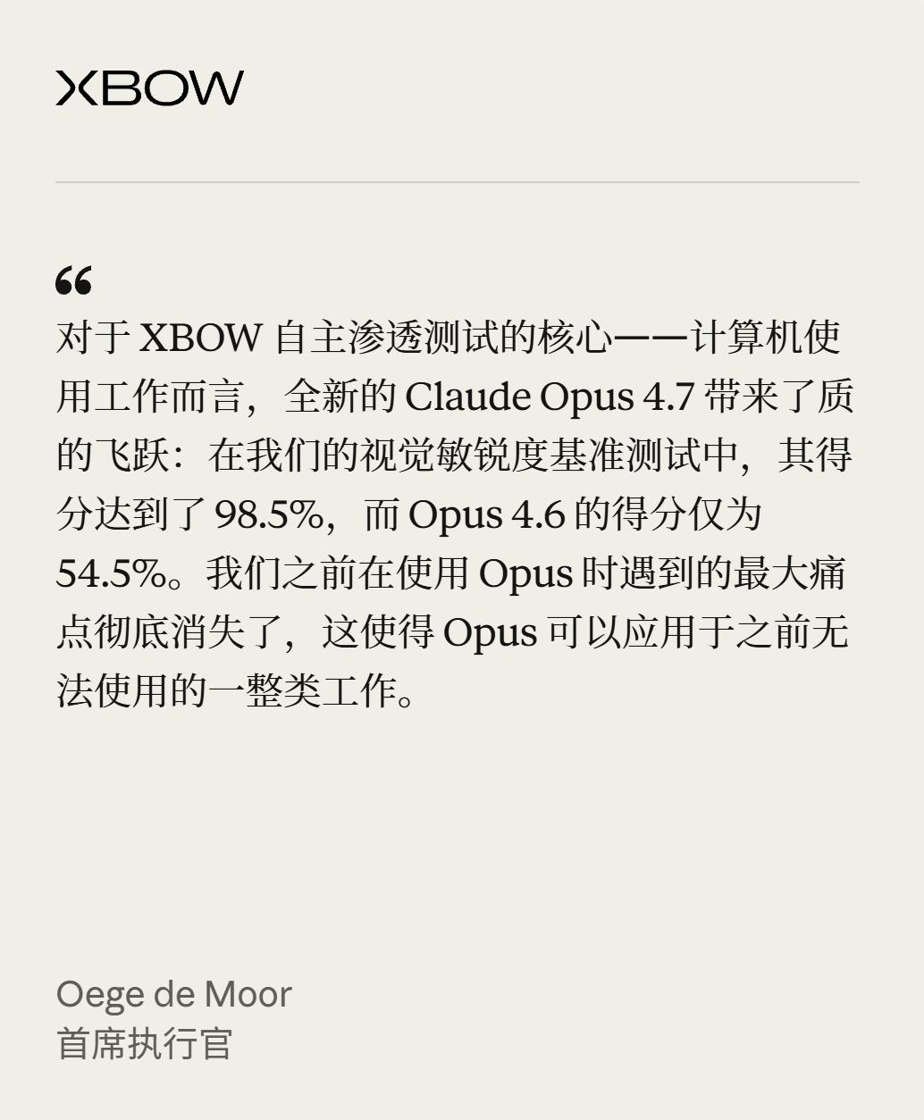 视觉能力在一些测试(如XBOW的基准测试)中,Opus 4.7相比Opus 4.6得分直接翻倍,从54.5%跃升到接近满分98.5!