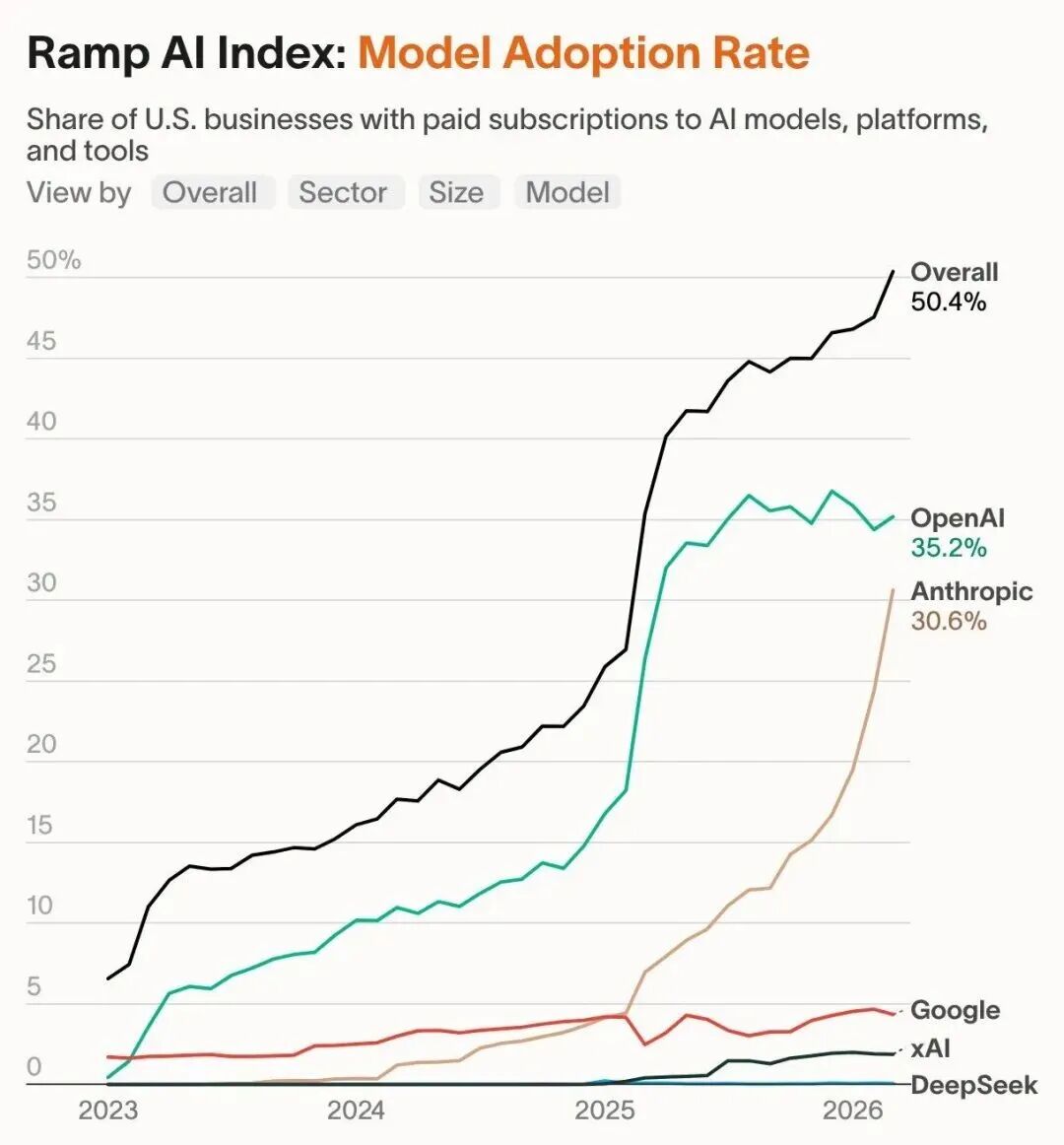 企业端的数据更夸张——根据企业支出追踪平台 Ramp 的数据,今年 1 月和 2 月,Ramp 上付费使用 Anthropic 服务的企业占比连续两个月大幅增长,而 OpenAI 的份额同期下滑。