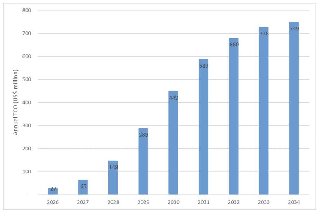 为了用真实数据支撑讨论,ABI 以美国的 T-Mobile 为例进行了模拟计算。T-Mobile US 曾在 GTC 大会上表示,“ kinetic tokens”将为全球电信运营商带来巨大机遇,而为了利用其基础设施资产,运营商需要 AI-RAN 系统以及在网络中部署 GPU。假设 T-Mobile US 在美国运营约 13,000 个屋顶基站站点,并开始为其配备 AI-RAN 服务器(此场景中采用英伟达 ARC-1 服务器,单价 6 万美元,每台为三个基站提供算力),且到 2035 年完成部署,实现屋顶站点 GPU 全覆盖——那么包括部署、冷却及其他辅助成本在内,累计总成本将达到 37 亿美元。如下所示的图表展示了该示例部署场景下的年度总体拥有成本:
