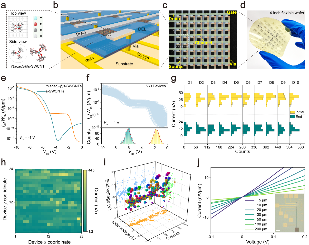 图1 基于Y(acac)3@s-SWCNT异质结构的柔性晶圆制备过程及其电学均匀性表征