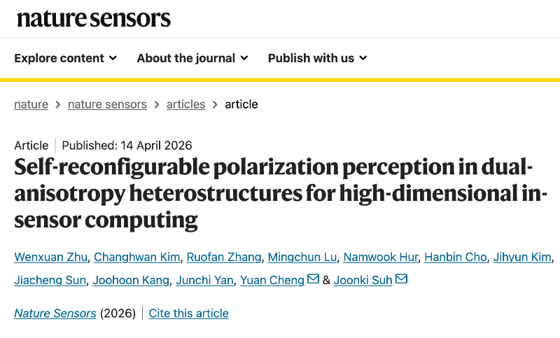 4月14日,上海交通大学人工智能学院程远课题组在智能感知与光电计算交叉方向取得重要进展。团队在Nature Sensors发表最新成果——“Self-reconfigurable polarization perception in dual-anisotropy heterostructures for high-dimensional in-sensor computing”,发布全球首个偏振感算器“玄鉴”PolarSight SPU。该成果首次将偏振感知阵列与光神经网络前端深度融合,使系统能够在获取偏振信息的同时完成前端特征处理与计算,为全场景通用智能感算系统提供了新的技术路径。程远副教授为论文通讯作者。