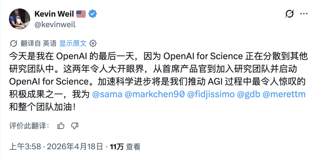 同一天,前首席产品官 Kevin Weil 也发帖:今天是我在 OpenAI 的最后一天。