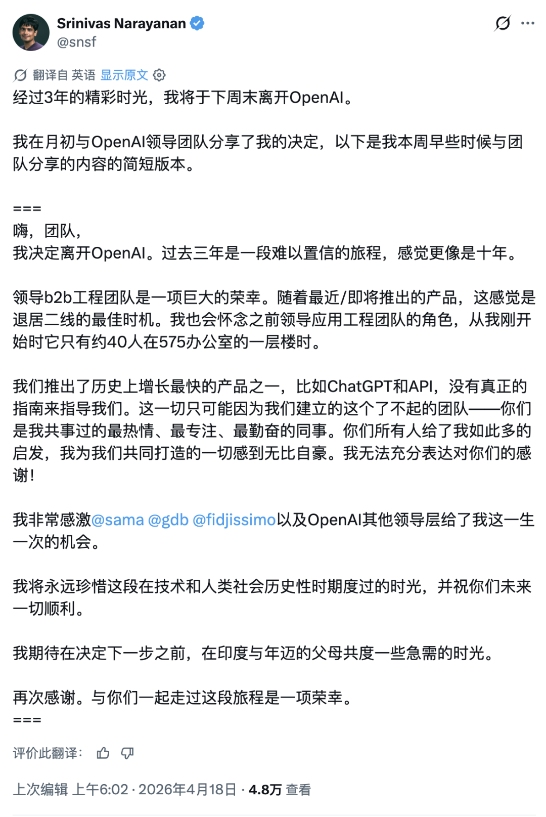 与此同时,OpenAI 还有另一个内部动作,悄悄同步发生:企业应用 CTO Srinivas Narayanan 将于下周末离职,理由是回家陪家人。Narayanan 此前是 OpenAI 工程 VP。