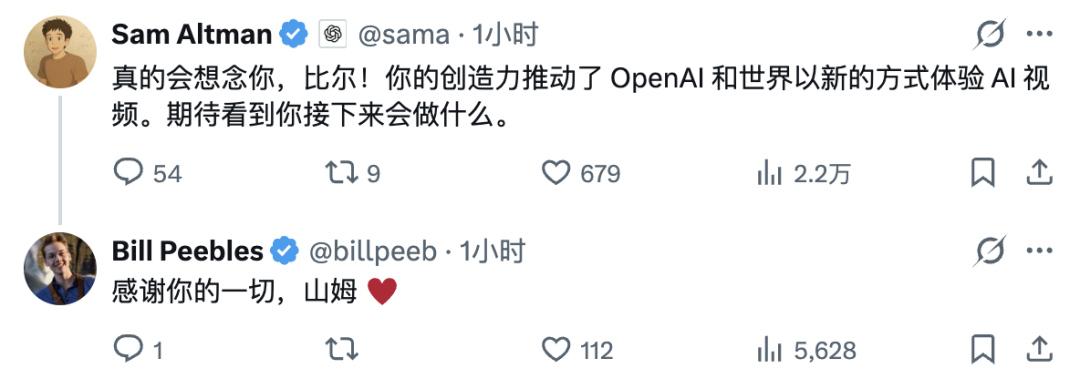 OpenAI CEO Sam Altman(山姆·奥特曼)在评论区秒回:真的会很想念你,Bill,你的创造力让全世界以新的方式体验了 AI 视频,期待看你接下来做什么。
