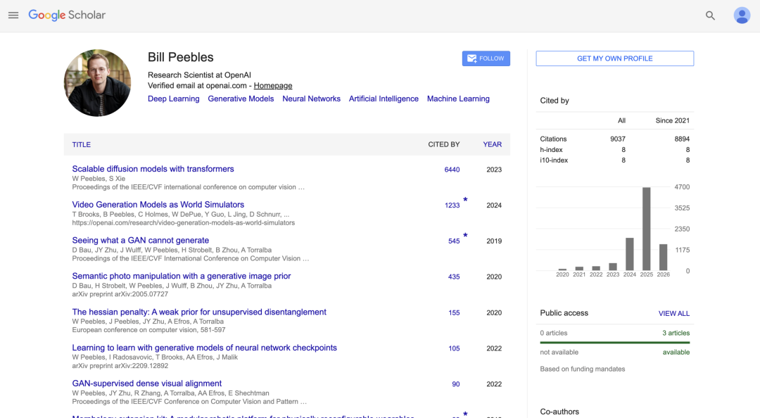 后来 OpenAI 在 Sora 的技术说明中明确表示,Sora 采用的正是 diffusion transformer 架构。因此 DiT 通常被视为这一路线的重要先导工作。带着这套积累,Peebles 加入 OpenAI,和 Tim Brooks、Aditya Ramesh 一起,开始搞 Sora。