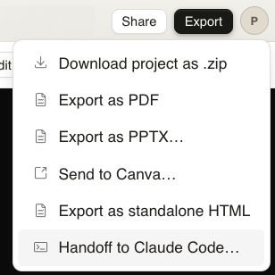 设计完成后,可导出为 Canva、PDF、PPTX 或独立 HTML 文件,也可以一键打包成交付包传给 Claude Code,用一条指令启动开发落地。