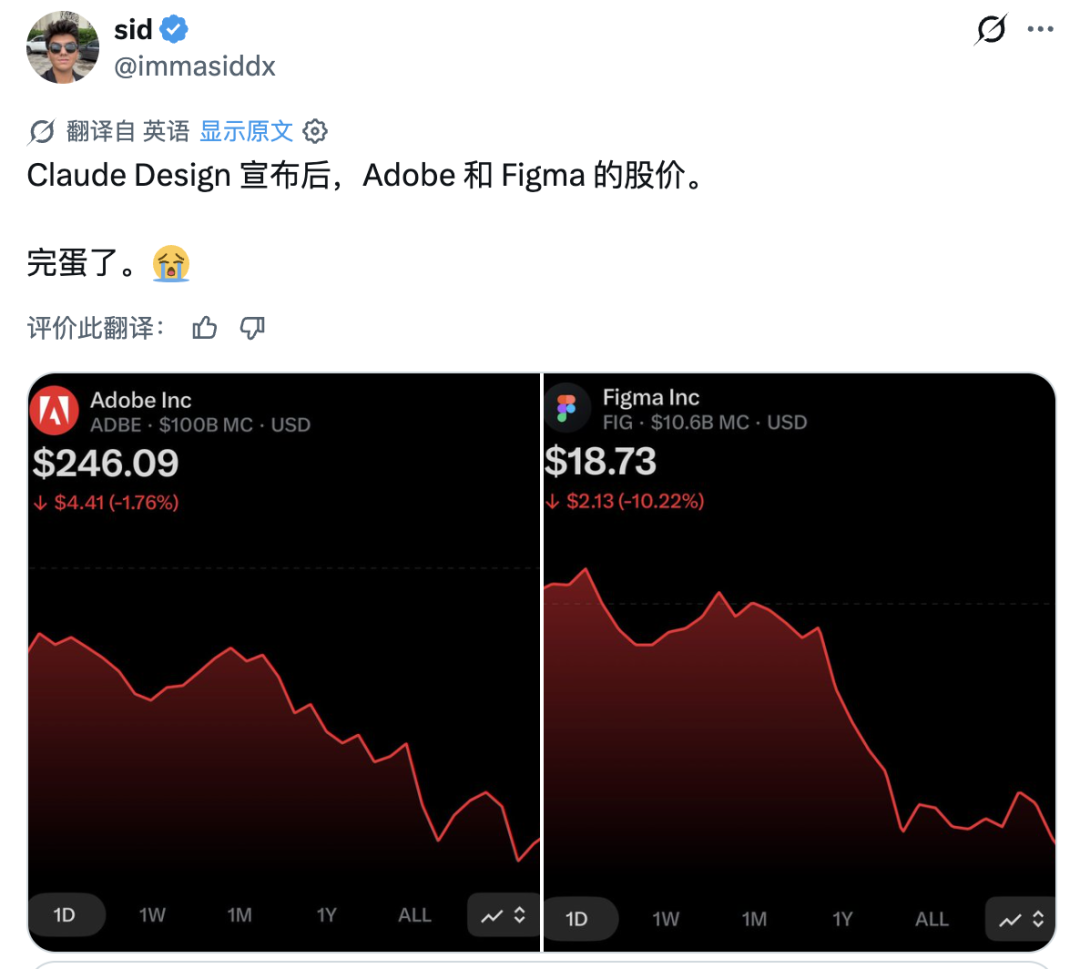 Claude Design 发布后,Figma 和 Adobe 的股价也不出意外地跌跌不休。