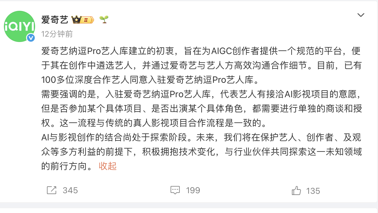 凤凰网科技讯 4月20日,爱奇艺官微发文回应纳逗Pro艺人库建立的初衷,旨在为AIGC创作者提供一个规范的平台,便于其在创作中遴选艺人,并通过爱奇艺与艺人方高效沟通合作细节。入库代表艺人有接洽AI影视项目的意愿,但是否参加某个具体项目都需要进行单独的商谈和授权。