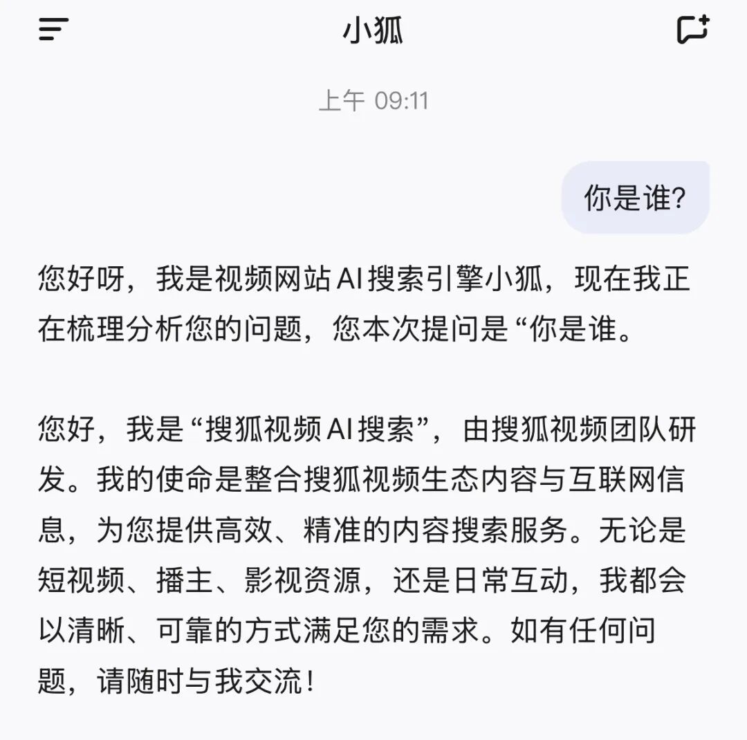 据郭静的互联网圈观察,4月17日,搜狐在苹果应用商店App Store上线了一款名为“小狐”的AI助手产品。从图片介绍来看,其多次提到了“AI搜索引擎”概念。当我向它提问“你是谁”时,其回复称,它是视频网站AI搜索引擎小狐,由搜狐视频团队研发。