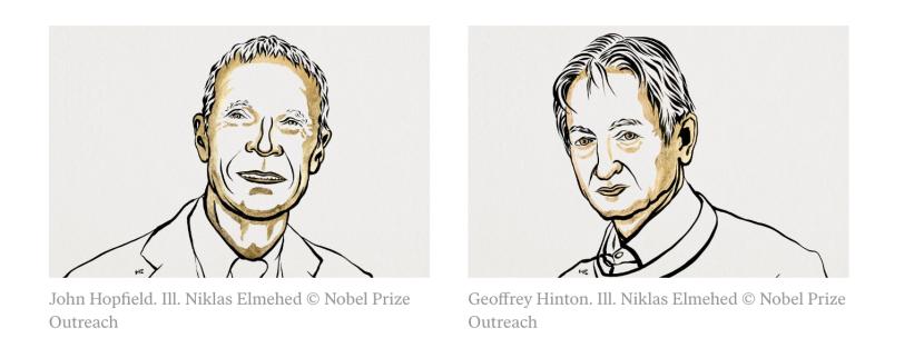 北京时间 10 月 8 日,2024 年诺贝尔物理学奖正式授予了约翰·J·霍普菲尔德 (John J. Hopfield) 和杰弗里·E·辛顿 (Geoffrey E. Hinton),“表彰他们通过人工神经网络实现机器学习的基础性发现和发明”。
