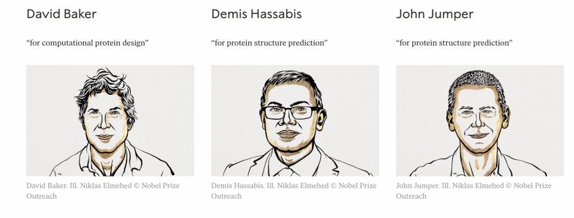 Hassabis 和 Jumper利用AI解决了一个困扰学界长达半个世纪的难题;另一位化学奖得主David Baker成功完成了这一几乎不可能完成的壮举——制造全新种类蛋白质。