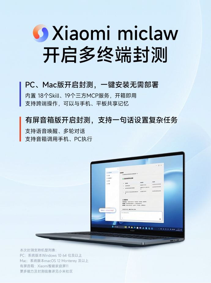 小米宣布上线PC版龙虾,Xiaomi miclaw正式开启PC、Mac、有屏音箱多终端封测