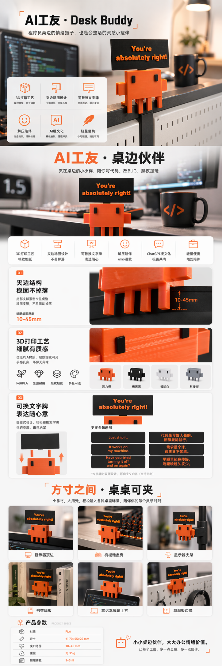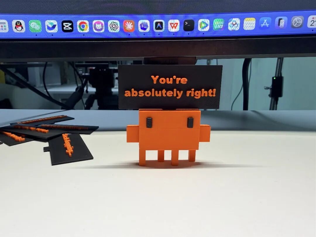 我们公司之前3D打印了一个桌面的小摆件,拿来直播的时候送粉丝玩的,是Claude Code那个吉祥物的周边,可以夹在显示器边上,头上举着一块小黑板,挺好玩的一个小东西。