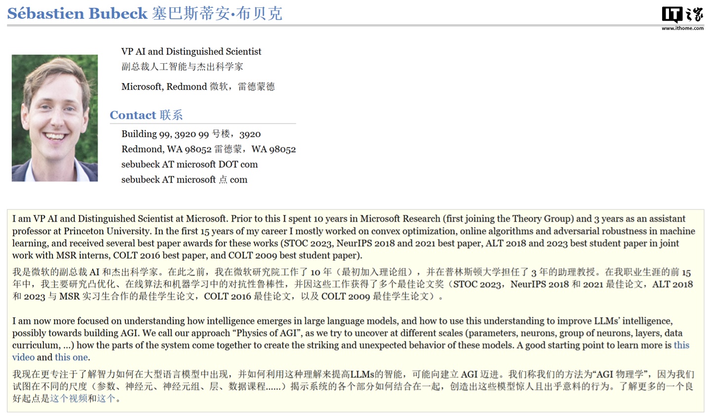 IT之家在其个人网站获悉,Sébastien Bubeck 此前在微软研究院工作了 10 年,并在普林斯顿大学担任了 3 年的助理教授。现在其更专注于了解智力如何在大型语言模型中出现,并想要以此来提高 LLMs 的智能,向建立 AGI(通用人工智能)迈进。