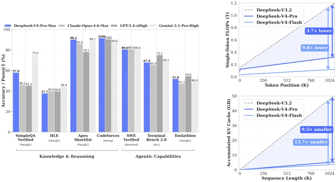 据介绍,DeepSeek-V4-Flash 模型采用混合专家(MoE)架构,总参数量达 284B,激活参数 13B,支持百万 token(词元)上下文长度。预训练数据超 32Ttoken,在最大推理力度模式(Flash-Max)下推理能力逼近 Pro 版本。