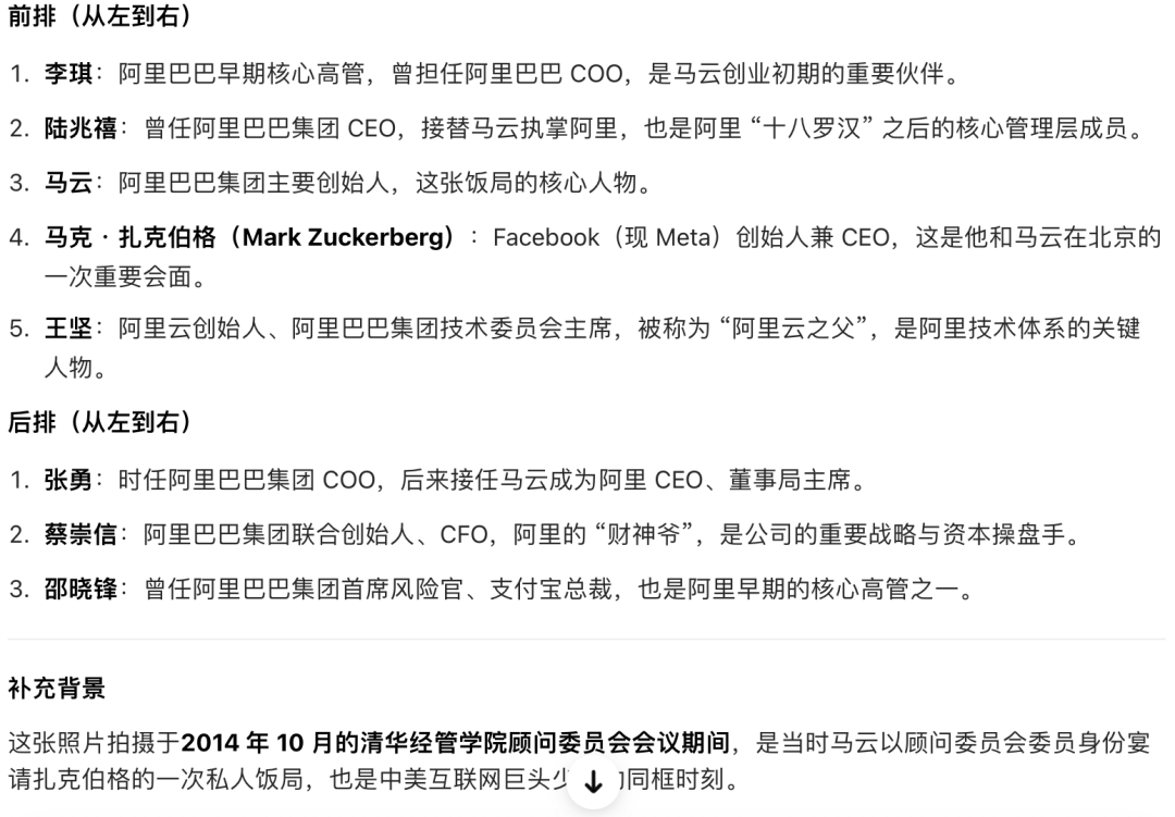 一个小插曲是,当把这两张大佬聚餐图再喂给豆包,让判断出席人物时候,豆包得出了这样的结论: