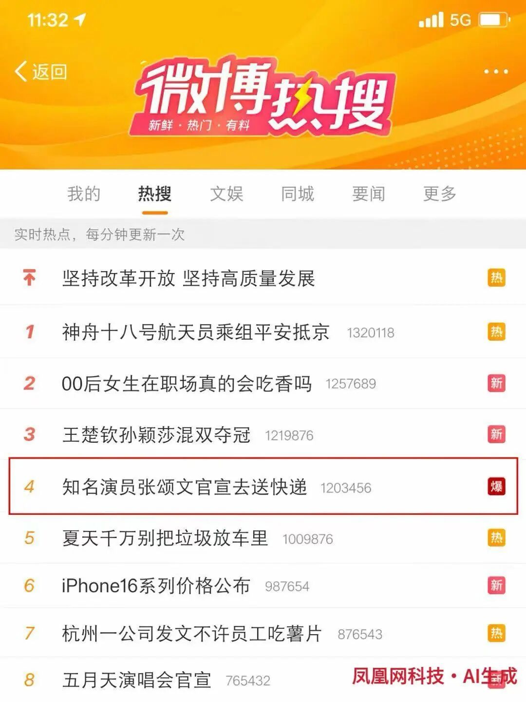 这里的给出提示词仅是:生成一张微博热搜截图,其中一条消息是知名演员官宣去送快递。不知为何AI自动提取了张颂文……