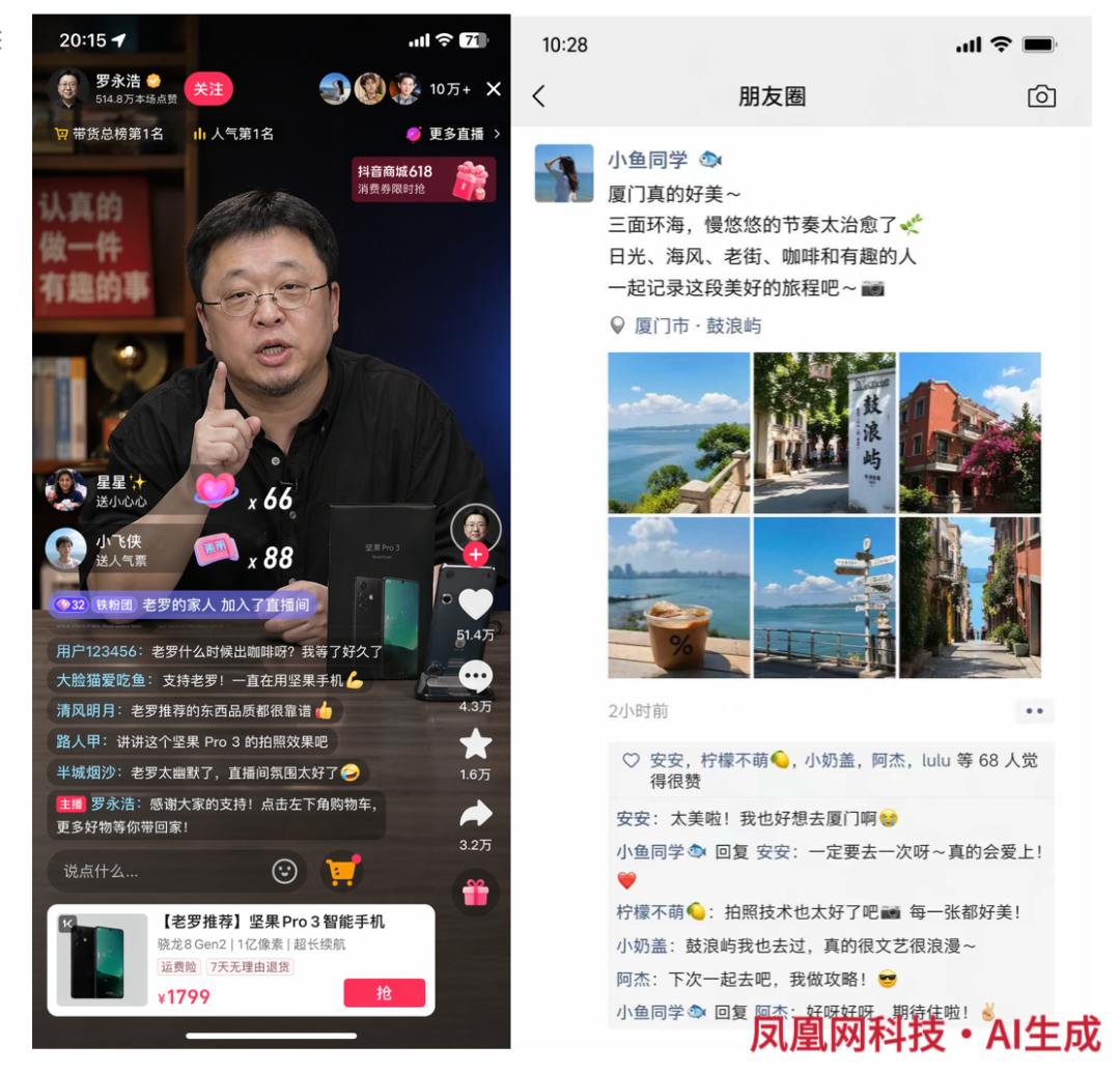 提示词:生成一张罗永浩抖音直播截图画面,包括主播、评论、互动数据等;生成一张微信朋友圈截图画面,分享旅游打卡,带图片带文案,带互动点赞评论