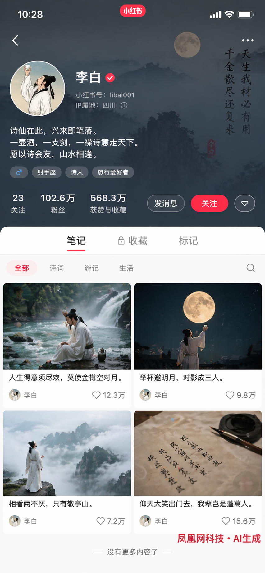 “仿造”一个小红书百万粉丝账号,手拿把掐。甚至AI会自动设计“天生我材必有用,千金散尽还复来”和明月高悬的账号背景。